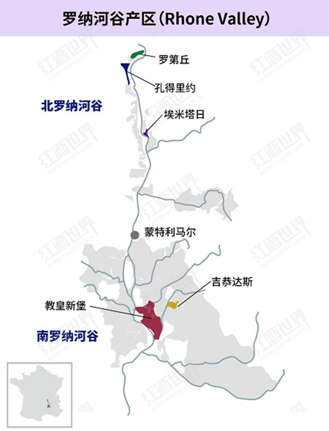 羅納河谷位于法國南部,整體沿著羅納河(Rhone River)由北向南呈條狀分布。這里歷史悠久,一直是法國備受追捧的葡萄酒產(chǎn)區(qū)。因南北區(qū)域的自然環(huán)境差異較大,羅納河谷產(chǎn)區(qū)一般被分成兩個部分,其中瓦朗斯鎮(zhèn)(Valence)以北為北羅納河谷(North Rhone),蒙特利馬爾鎮(zhèn)(Montelimar)以南為南羅納河谷(South Rhone)。北羅納屬于溫和的大陸性氣候,葡萄園多位于陡峭的山坡上,這里主要生產(chǎn)西拉(Syrah)紅葡萄酒,但也會釀造少量維歐尼(Viognier)、瑚珊(Roussanne)和瑪珊(Marsanne)白葡萄酒。南羅納則屬于地中海氣候,這里炎熱干燥且風(fēng)力強勁,葡萄園的地形更為平坦。南羅納擁有比北羅納更加豐富的葡萄品種,包括西拉、歌海娜(Grenache)、慕合懷特(Mourvedre)和白歌海娜(Grenache Blanc)等。其中,最為重要的是歌海娜,其常與西拉、慕合懷特和神索(Cinsault)等品種一同混釀。