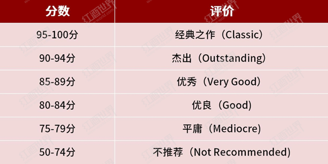為了提升雜志的內容質量,WS在給新發布的酒款做品評的同時,也在不斷改進自己的評價機制。從修正版加州大學戴維斯分校九分制(Modified UC Davis Nine-point Scale)到歐洲二十分制,再到挑選出“觀者之選(Spectator Selections)”、“高性價比(Best Buys)”和“不推薦(Not Recommended)”酒款,WS對葡萄酒的評價機制幾經變換。1985年,WS決定采用百分制來評價葡萄酒并沿用至今。百分制以50分為起評分,將酒款劃分為六個等級: