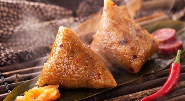 以上等醬油腌制的新鮮肥瘦豬肉為餡,有些地區(qū)還搭配著板栗、花生、香菇等配料。煮熟后的粽子是肉味濃郁、香滑軟糯,口感鮮香。