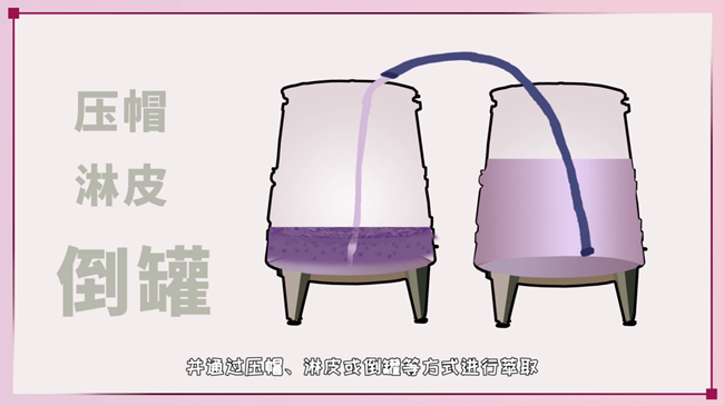 ③ 將完整的整串葡萄與經破碎的葡萄混合:發酵開始后,在經過破碎的葡萄中加入整串葡萄,這些葡萄浸泡在其中與氧氣隔絕,便會開始果內發酵。發酵過程中經過壓帽,完整的葡萄便會逐漸破碎。