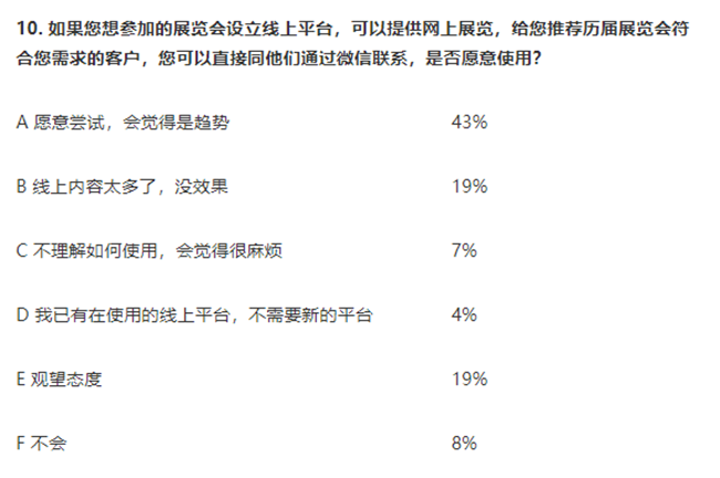 5. 68%的企業對線上形式的轉型方向感興趣,包括:線上電商、抖音、網紅、短視頻微、信群、朋友圈、微店、線上品牌推介會、線上展會等渠道。