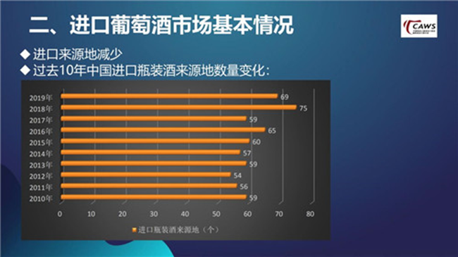 此外,進(jìn)口來(lái)源地減少,2019年瓶裝酒進(jìn)口來(lái)源地前十位約占進(jìn)口總額的96.0%。其中,又以澳大利亞葡萄酒的表現(xiàn)最為突出,在2019年以8個(gè)點(diǎn)的差距反超了法國(guó)葡萄酒,但在接下來(lái)的市場(chǎng)競(jìng)爭(zhēng)中,澳大利亞葡萄酒也面臨一定挑戰(zhàn):首先,零關(guān)稅、大品牌驅(qū)動(dòng)、投資移民等因素的推動(dòng)作用會(huì)在階段性變化中逐漸減弱,澳洲與法國(guó)在接下來(lái)的市場(chǎng)中差距不會(huì)進(jìn)一步拉大;其次,意大利、智利等國(guó)葡萄酒在中國(guó)市場(chǎng)競(jìng)爭(zhēng)愈加激烈化,近兩三年來(lái),他們明顯加強(qiáng)了在中國(guó)市場(chǎng)的投入,處在一個(gè)比較穩(wěn)定的上升階段,我個(gè)人比較看好他們接下來(lái)的表現(xiàn)。