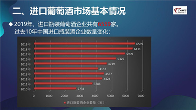 進(jìn)口瓶裝葡萄酒企業(yè)數(shù)量不斷增加,中小企業(yè)面臨挑戰(zhàn)。 從過(guò)去10年的數(shù)據(jù)來(lái)看,中國(guó)進(jìn)口瓶裝葡萄酒企業(yè)數(shù)量整體上是不斷增加的。2019年也不例外,進(jìn)口瓶裝葡萄酒企業(yè)共有6559家,比2018年增加了148家。產(chǎn)生這種情況的原因,我認(rèn)為有兩個(gè),一是葡萄酒的商品屬性,決定了它經(jīng)營(yíng)上的分散化;二是中國(guó)葡萄酒企業(yè)自身韌性十足,在市場(chǎng)大調(diào)整時(shí)期仍在堅(jiān)持。