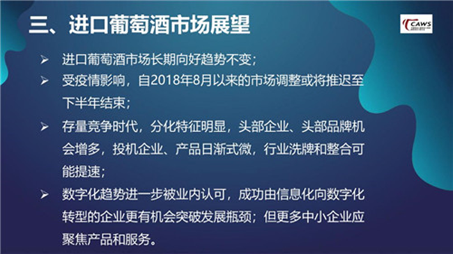 調(diào)整期被延長(zhǎng),進(jìn)口葡萄酒市場(chǎng)格局競(jìng)爭(zhēng)更為激烈。 需要注意的是,自2018年8月開(kāi)始,中國(guó)葡萄酒市場(chǎng)進(jìn)入到調(diào)整期。由于受到2020年疫情的影響,整個(gè)調(diào)整期結(jié)束時(shí)間將被延長(zhǎng),至于何時(shí)能結(jié)束,與當(dāng)下疫情防控工作的進(jìn)展緊密相關(guān)。如果防控進(jìn)展較為理想,我認(rèn)為在今年下半年開(kāi)始,市場(chǎng)將逐漸恢復(fù)。