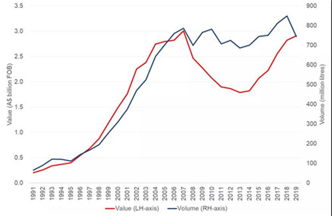 近日,澳大利亞葡萄酒管理局公布了最新出口報(bào)告。截至2019年12月底的12個(gè)月,澳大利亞葡萄酒對中國市場的出口總額及平均出口額雙雙創(chuàng)下年度新高。