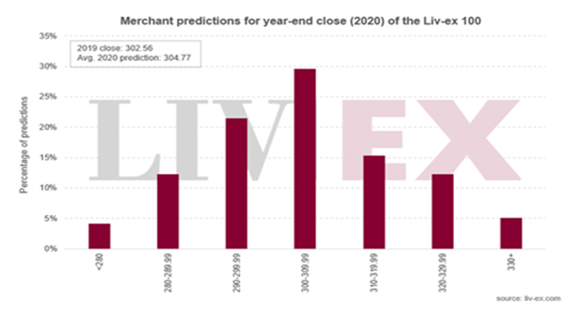 今年,Liv-ex會員預(yù)測優(yōu)質(zhì)葡萄酒市場將在2020年持平。平均而言,受訪者預(yù)測此行業(yè)基準(zhǔn)指數(shù)將上升0.7%,收于304.77點(diǎn)。 預(yù)測的中位數(shù)則稍低,為303.00點(diǎn),上升0.1%。