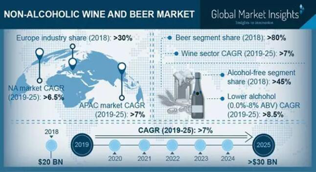 隨著消費(fèi)者生活水平的提高,健康意識(shí)不斷加強(qiáng),無(wú)醇葡萄酒和啤酒市場(chǎng)大幅增長(zhǎng)。根據(jù)全球市場(chǎng)洞察(Global Market Insights)最新報(bào)告,無(wú)醇葡萄酒和啤酒市場(chǎng)規(guī)模將于2025年達(dá)到300億美元。