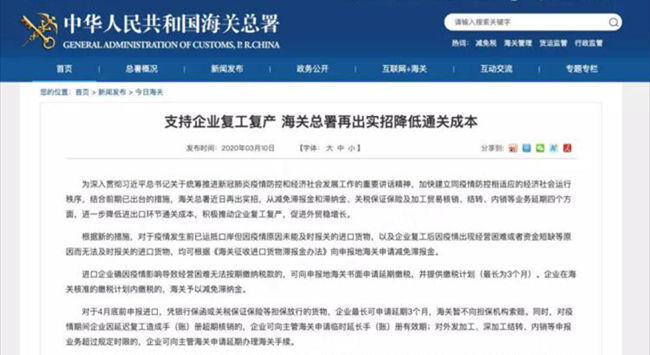 海關(guān)總署3月10日在其官網(wǎng)發(fā)布《支持企業(yè)復(fù)工復(fù)產(chǎn) 海關(guān)總署再出實招降低通關(guān)成本》的文章。