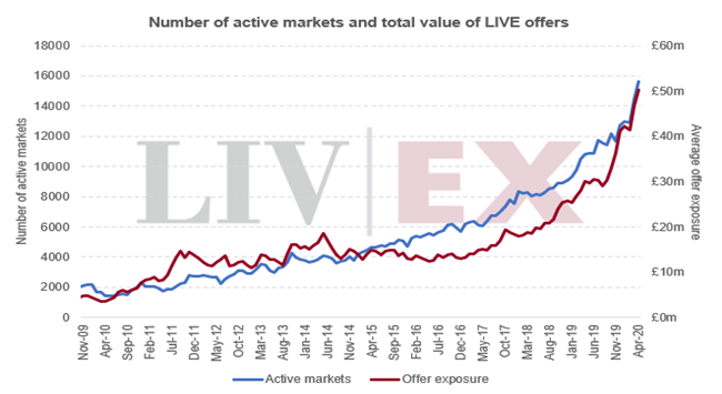 在冠狀病毒下,現在更多酒商遙距工作,商店、而飯店和旅館等傳統渠道也已關閉,這令Liv-ex平臺上的交易更加活躍。隨著提供選擇的葡萄酒類型不斷擴大,活躍市場(有出價或競價的葡萄酒(LWIN11))數量也已突破了15,500款!
