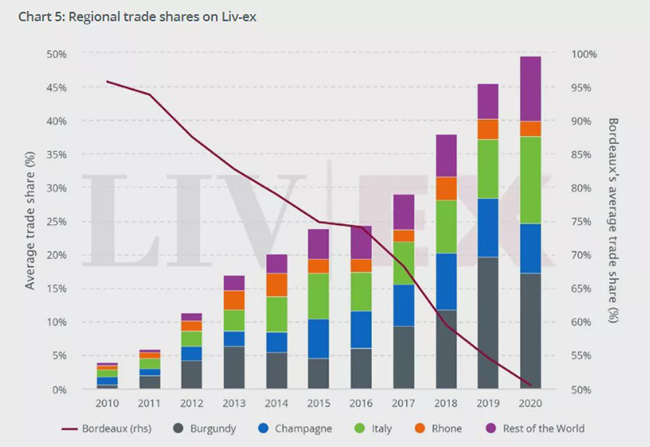 一些新的區域如布魯奈羅、巴羅洛、香檳也吸引著買家的注意。今年到目前為止,波爾多葡萄酒的貿易份額為51%,勃艮第17%,意大利13%,香檳7%,羅納河谷2%。世界其他地區的葡萄酒價格已經從最近的平均5%上升到10%,部分原因是受到了來自新世界的免稅葡萄酒的推動。
