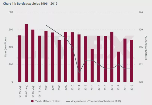 在2019年,最活躍的波爾多葡萄酒年份是2009年(15%)、2016年(12%)和2010年(10%)。一級名莊葡萄酒占波爾多葡萄酒交易總額的34%,而2018年這一比例為37%。波爾多的整體貿易份額很大程度上受到一級酒莊貿易價值的影響,因為這五款酒具有高價值和高產量的雙重優勢。在2019年,它們的平均價格下跌了6%,而銷量占據了波爾多葡萄酒總銷量的11%。
