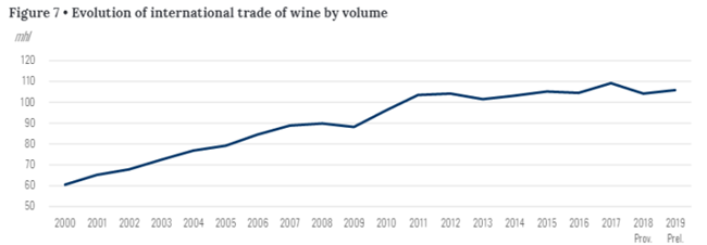 (2000—2019葡萄酒國(guó)際貿(mào)易量的演變)
