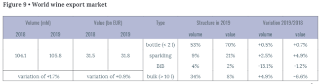 瓶裝葡萄酒占2019年全球葡萄酒出口總價(jià)值的70%