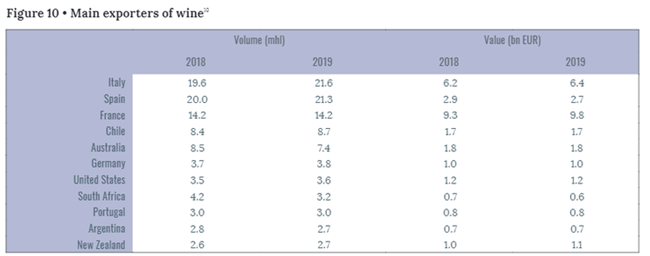 與2018年相比,意大利(+29%)、阿根廷(+26%)、智利(+13%)、西班牙(+12%)和法國(guó)(+12%)的大宗出口額大幅增長(zhǎng),而德國(guó)(-19%)、澳大利亞(-18%)和南非(-17%)的大宗出口額則大幅下降。