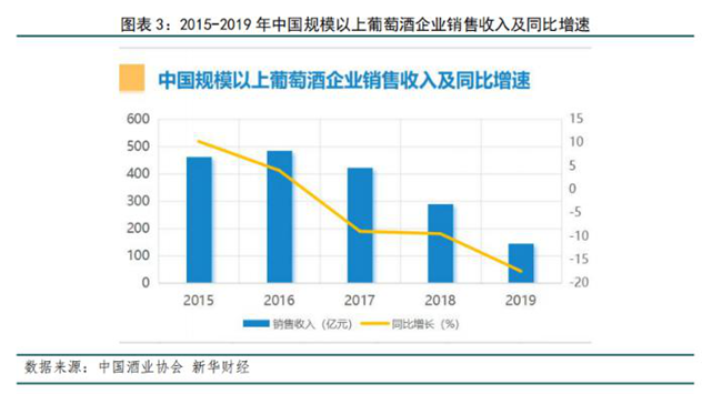 2019年,全國(guó)規(guī)模以上葡萄酒企業(yè)數(shù)量155家,銷(xiāo)售收入145.09億元,同比減少17.51%;實(shí)現(xiàn)利潤(rùn)總額10.58億元,同比降低16.74%。2020年第一季度,銷(xiāo)售收入18.95億元,下降44.02%;利潤(rùn)0.01億元,下降99.24%。全國(guó)葡萄酒行業(yè)規(guī)模以上企業(yè)經(jīng)濟(jì)效益在2019年本就低迷的情況下,受新冠肺炎疫情影響,在2020年第一季度顯得更加慘淡。