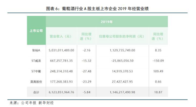 2019年四家葡萄酒企實(shí)現(xiàn)總營(yíng)收61.24億元,同比降低5.84%;實(shí)現(xiàn)歸屬于母公司凈利潤(rùn)11.46億元,同比增加18.87%。其中,張?jiān)I(yíng)收達(dá)50.31億元,雖然稍低于年初制定的力爭(zhēng)實(shí)現(xiàn)營(yíng)業(yè)收入不低于53億元的目標(biāo),但其龍頭地位毋庸置疑,經(jīng)營(yíng)業(yè)績(jī)遙遙領(lǐng)先。并且,張?jiān)?019年?duì)I收占全國(guó)葡萄酒行業(yè)規(guī)模以上企業(yè)銷(xiāo)售收入的34.68%;2019年實(shí)現(xiàn)歸母凈利11.30億元,超過(guò)了全國(guó)葡萄酒行業(yè)規(guī)模以上企業(yè)利潤(rùn)總額(10.58億元)。