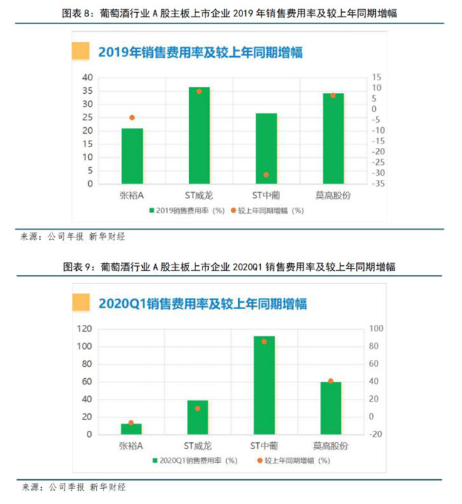 銷(xiāo)售費(fèi)用率水平一定程度上反應(yīng)了酒企在品牌和渠道建設(shè)上做出的努力。2019年四家葡萄酒企銷(xiāo)售費(fèi)用率高于20%,行業(yè)整體處于高位水平,這也在一定程度上反應(yīng)出葡萄酒市場(chǎng)競(jìng)爭(zhēng)更加激烈。其中,ST威龍表現(xiàn)最突出,2019年銷(xiāo)售費(fèi)用率達(dá)36.4%,較上年同期增幅8.45%,其年報(bào)解釋稱主要是報(bào)告期內(nèi)促銷(xiāo)費(fèi)增加所致。