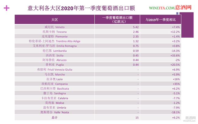 細分到各大區,2020年第一季度葡萄酒出口額排名前三位的依次是威尼托大區(Veneto)、托斯卡納大區(Toscana)和皮埃蒙特大區(Piemonte)。