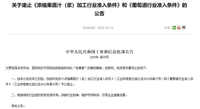 8月10日,中華人民共和國工業(yè)和信息化部發(fā)布公告,稱即日起廢除《濃縮果蔬汁(漿)加工行業(yè)準入條件》(工業(yè)和信息化部公告2011年第27號)和《葡萄酒行業(yè)準入條件》(工業(yè)和信息化部公告2012年第22號)。此外,鼓勵相關(guān)行業(yè)組織積極發(fā)揮作用,加強行業(yè)自律,維護市場秩序,引導企業(yè)健康發(fā)展。