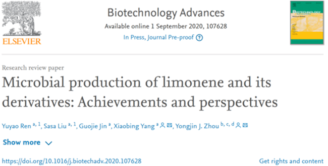 近日,葡萄酒學(xué)院楊曉兵副教授團隊在著名生物技術(shù)學(xué)術(shù)期刊《Biotechnology Advances》(IF=10.744)發(fā)表了題為 “Microbial production of limonene and its derivatives: Achievements and perspectives” 的綜述文章,系統(tǒng)總結(jié)了近年來利用代謝工程和合成生物學(xué)策略合成檸檬烯及其衍生物研究進展。西北農(nóng)林科技大學(xué)為第一署名單位,中科院大連化學(xué)物理研究所為合作單位;16級本科生任毓瑤和18級博士研究生劉灑灑為共同第一作者,我校楊曉兵副教授與大連化物所周雍進研究員為共同通訊作者,我校靳國杰副教授參與了該綜述的撰寫工作。《Biotechnology Advances》是生物技術(shù)領(lǐng)域頂級國際期刊,在105種應(yīng)用微生物與生物技術(shù)相關(guān)的雜志中排名第3,該雜志全年收錄文章在100篇左右,2019年H指數(shù)161。