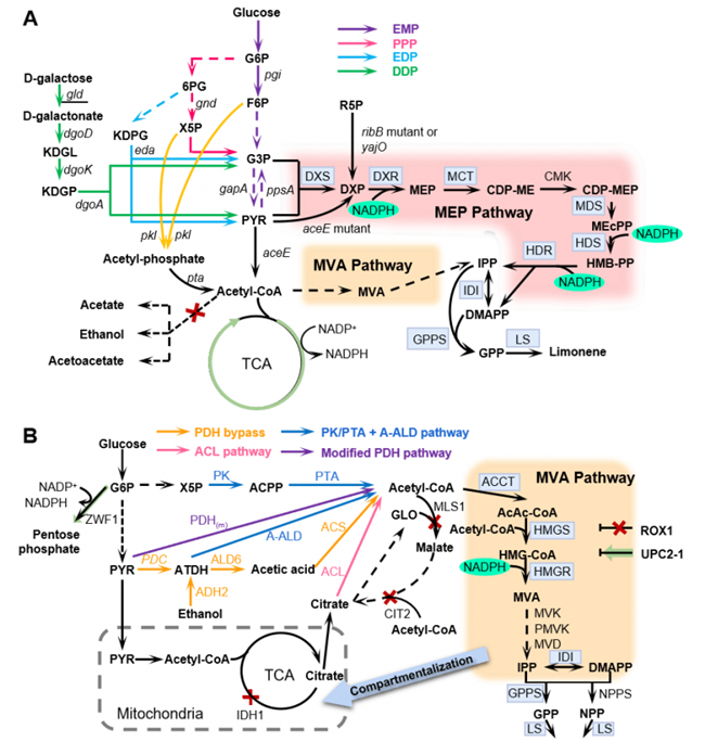 楊曉兵副教授團隊長期致力于利用代謝工程和合成生物學(xué)策略構(gòu)建高價值化合物細胞工廠的研究工作。目前,已利用代謝工程策略成功改造圓紅冬孢酵母(Rhodosporidium toruloides)構(gòu)建了檸檬烯等單帖化合物、羥基化脂肪酸、氨基酸衍生物的細胞工廠,其中檸檬烯微生物合成相關(guān)研究工作獲得陜西省面上基金(2020JM177)、學(xué)校科研啟動基金、國家級科創(chuàng)等支持,指導(dǎo)2016本科生任毓瑤畢業(yè)論文獲得校級畢業(yè)論文。該綜述介紹了微生物合成檸檬烯及其衍生物面臨的機遇與挑戰(zhàn),詳細闡述了異戊二烯途徑多樣性、代謝路徑關(guān)鍵酶的發(fā)掘與表征、宿主細胞代謝路徑的理性調(diào)控、輔因子平衡、檸檬烯及其衍生物生物毒性的解除及提升宿主微生物魯棒性的策略等內(nèi)容。本綜述詳盡討論了大腸桿菌、釀酒酵母、藍細菌和產(chǎn)油酵母等生產(chǎn)平臺菌株的優(yōu)勢與不足,為系統(tǒng)地理性改造微生物代謝網(wǎng)絡(luò)構(gòu)建單帖細胞工廠提供了科學(xué)參考。