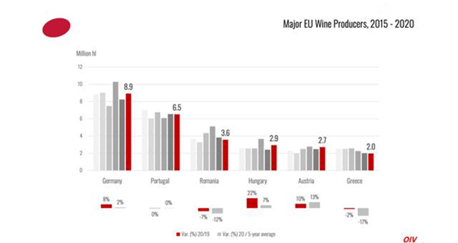 其他歐盟大型葡萄酒生產(chǎn)國與2019年相比也出現(xiàn)了正增長,如德國(8.9 mhl, +8%/2019)、匈牙利(2.9 mhl,+22%/2019)和奧地利(2.7 mhl, +10%/2019)。