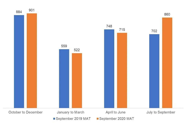 在截至2020年9月的12個月中,出口額的增長主要受到了英國和中國大陸的良好出口表現的推動。尤其在這12個月中的最后一個季度,這種漲勢尤為強勁。