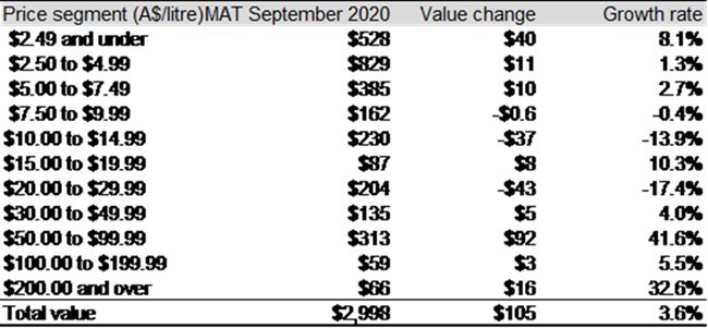 在截至2020年9月的12個月中,澳大利亞葡萄酒的平均出口額增長了4%至3.89澳元/升(離岸價),這一數據也和總出口額的增長相匹配。出口量小幅下降0.4%至7.71億升(等量于8570萬箱9升裝)。