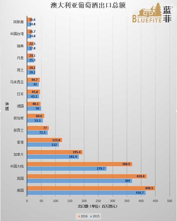 2016年的《澳大利亞葡萄酒出口報告》顯示,2015年6月至2016年6月,澳大利亞的葡萄酒出口額達到21.1億美元(約人民幣140億9290萬元),同比增長11%;出口量則達到7億2,800萬升,同比增長0.5%。