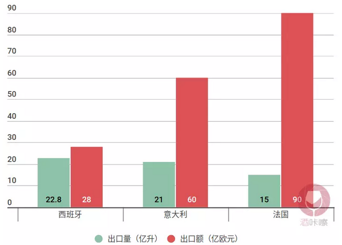 2017,西班牙葡萄酒的出口量超越法國和意大利,位居世界第一,不過盡管西班牙葡萄酒出口量如此龐大,它與意大利和法國葡萄酒所帶給人的印象完全不同,在人們的印象中,西班牙葡萄酒向來價格便宜,而這一點在其出口額上也能體現(xiàn)。