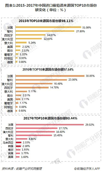 根據(jù)2017中國進口葡萄酒貿(mào)易數(shù)據(jù),TOP10來源國市場份額從2015年的98.11%降至2017年的93.45%,進口來源國繼續(xù)邁向多元化。法國占比繼續(xù)下降,澳大利亞、西班牙延續(xù)上升勢頭,葡萄牙、阿根廷前十地位被擠占。值得注意的是,新晉前十的馬來西亞、韓國、英國葡萄酒進口量從無到有,直接碾壓葡萄牙、阿根廷,躍居第六、七大來源國。