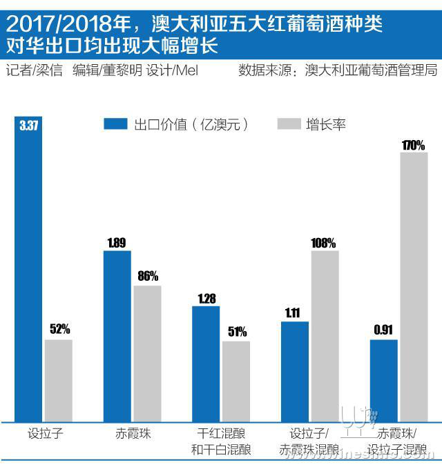 2017/2018年,澳大利亞五大紅葡萄酒種類對華出口均出現(xiàn)大幅增長。設(shè)拉子增長52%至3.37億澳元,赤霞珠增長86%至1.89億澳元,干紅混釀和干白混釀增長51%至1.28億澳元,設(shè)拉子/赤霞珠混釀增長108%至1.11億澳元,赤霞珠/設(shè)拉子混釀增長170%至9100萬澳元。