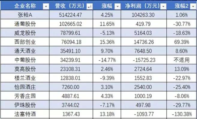 2018年被認為是中國葡萄酒行業(yè)的調整之年,整個葡萄酒行業(yè)呈現(xiàn)出小幅下滑的局面,據(jù)國家統(tǒng)計局數(shù)據(jù),2018年全國規(guī)模以上葡萄酒企業(yè)總產量62.9萬千升,比2017年下降7.36%;累計實現(xiàn)銷售收入288.51億元,同比下降9.51%;累計實現(xiàn)利潤總額30.63億元,同比下降9.46%。這12家上市企業(yè)發(fā)布的年報數(shù)據(jù),與去年整年的行業(yè)氛圍相符。大概也正是因為去年行業(yè)“看跌”的聲音不絕于耳,提前打了“預防針”,當全年數(shù)據(jù)公布和12家公司年報披露時,行業(yè)沒有表現(xiàn)出很大的落差。