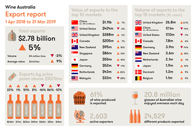 截至2019年3月底的一年中,澳大利亞葡萄酒總出口額增長(zhǎng)5%至27.8億澳元。