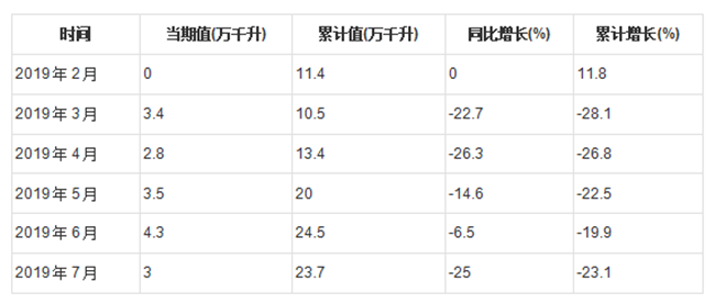 2019年7月全國葡萄酒產量為3萬千升,累計值為23.7萬千升,同比下降25%,累計下降23.1%。