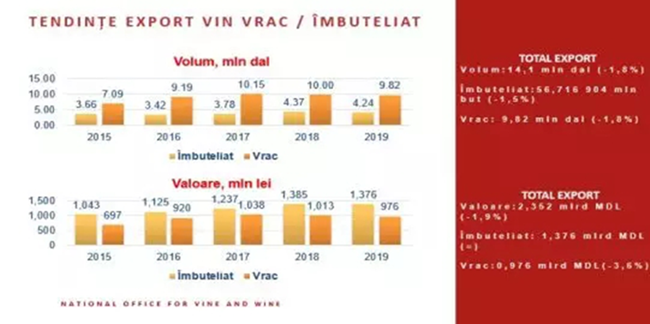 在2018-2019葡萄酒年度,摩爾多瓦共和國(guó)葡萄酒出口總量為14.1萬(wàn)千升(-1.8%),其中包含4.24萬(wàn)千升(56716.904瓶)瓶裝葡萄酒(-1.5%)以及9.82萬(wàn)千升(-1.8%)散裝葡萄酒。