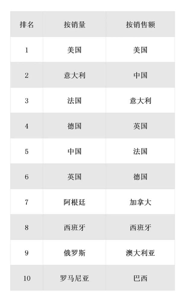 按銷售額計(jì)算,排名有更多的變動。意大利從第5位上升到第3位,英國從第3位下降到第4位,法國從第4位下降到第5位。西班牙和澳大利亞分列第8和第9位,巴西取代日本,躍居第10位。