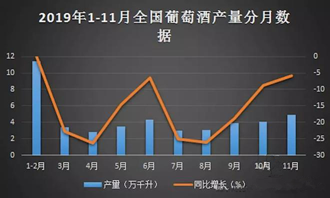 一方面是昂揚向上的精神勁頭,另一方面全國葡萄酒產量數據卻為其潑了一盆冷水。根據中國報告大廳對2019年1-11月全國葡萄酒產量進行監測統計顯示:2019年11月全國葡萄酒產量4.9萬千升,同比下降5.8%,2019年1-11月全國葡萄酒產量為37.2萬千升,累計下降12.1%。