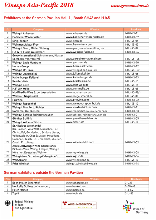 2018 年 5 月 29-31 日,Vinexpo 香港展將在香港會議展覽中心迎接其第20周年的到來。在此之際,德國聯(lián)邦食品和農(nóng)業(yè)部將再次組織德國展團集體參加 Vinexpo香港展,多達 29 家德國葡萄酒生產(chǎn)商或酒莊代表將會出席此次盛會。