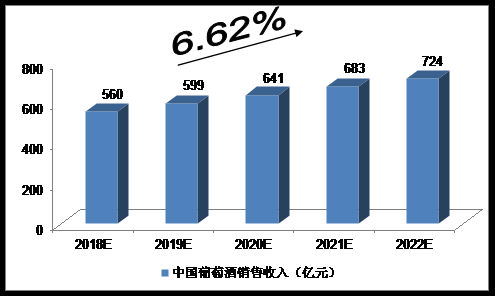 2016年,全國規(guī)模以上葡萄酒企業(yè)共240家,累計(jì)實(shí)現(xiàn)銷售收入484.54億元,同比增長(zhǎng)3.97%。我們預(yù)計(jì),2018年我國葡萄酒銷售收入將達(dá)到560億元,未來五年(2018-2022)年均復(fù)合增長(zhǎng)率約為6.62%,2022年將達(dá)到724億元。