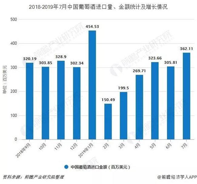 據中國海關總署數據顯示,2019年1-2季度中國葡萄酒進口量有所增長,2019年7月中國葡萄酒進口量為59956千升,同比增長3.3%。累計方面,2019年1-7月中國葡萄酒進口量達到395429千升,同比下降10.8%。