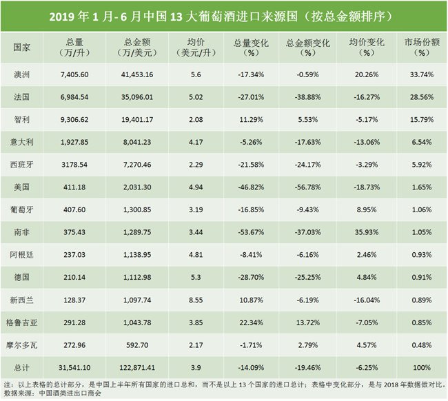 中國酒類進出口商會(China Chamber of Alcohol Importers and Exporters)公布了 2019 年 1 月- 6 月中國的 13 大葡萄酒進口來源國及相關數據: