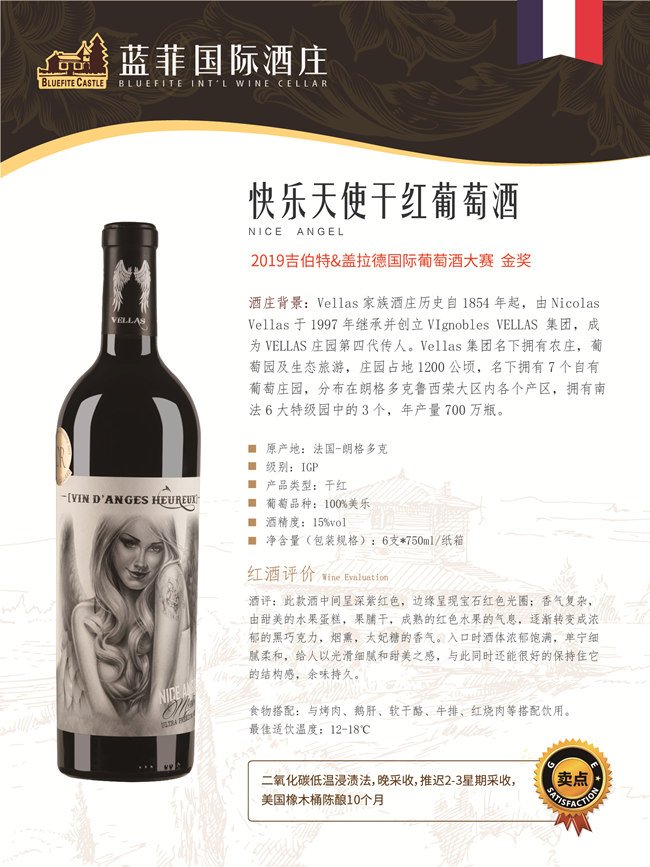 快樂天使干紅葡萄酒以100%美樂,采用二氧化碳低溫浸漬法釀造,而后經過美國橡木桶陳釀10個月,酒體中間呈深紫紅色,邊緣呈現寶石紅色光圈;擁有香氣復雜,由甜美的水果蛋糕,果脯干,成熟的紅色水果的氣息,逐漸轉變成濃郁的黑巧克力,煙熏,太妃糖的香氣,入口時酒體濃郁飽滿,單寧細膩柔和,給人以光滑細膩和甜美之感,與此同時還能很好的保持住它的結構感,余味持久。